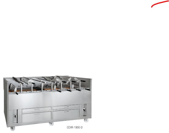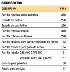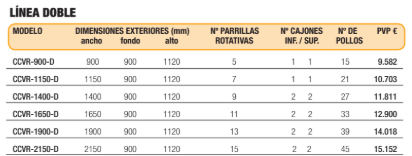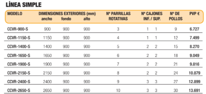 •Construidos en acero inoxidable.• Cámara revestida en ladrillo refractario de alta densidad.• Se suministran con parrillas rotativas para pollos abiertos. Para cambiopara otro tipo de espadas y parrillas consultar precios.• Fondo con ranura para que las cenizas evacúen en el cajón.• Cajón superior para recogida de cenizas. Cajón inferior para almacenaje.• Ladrillos fácilmente sustituibles.• Un motorreductor monofásico para los asadores simples.Dos para losasadores dobles.• Voltaje: 230V/50Hz.• Permiten asar al mismo tiempo diferentes tipos de alimentos, sinnecesidad de manipular constantemente la parrilla, porque tienen una granvariedad de espadas y parrillas diferentes.• Bajo pedido se pueden suministrar trifásicos: 400V/50Hz.• Bajo pedido se pueden suministrar combinadas con parrillas estáticas.• LAS ESPADAS PARA POLLOS SOPORTAN HASTA 3 POLLOS DE 1kg. DEPESO MÁXIMO CADA UNO.• LAS ESPADAS PARA COCHINILLO SOPORTAN HASTA 10Kg. DE PESOMÁXIMO
