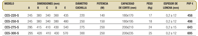 Características modelos estándar CES-S• Bandeja de corte, carro y protector de cuchilla en aluminio anodizadoprotegido contra oxidación.• Cuerpo en aluminio lacado.• Mango adicional en el carro para favorecer las operaciones de corte.• Transmisión por correa.• Mando graduado para selección del espesor de lonchas y tope adicionalde espesor máxima.• Cuchilla circular en acero inoxidable de gran resistencia.• Fácil limpieza.• Patas regulables.• Motor con protector térmico anticalentamiento.• Base cerrada. Protector de cuchilla y prensa-fiambres.• Sistema de seguridad antiarranque durante tareas de limpieza.• Voltaje: 230V/50Hz.
