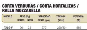 • Construida completamente en aluminio anodizado.• Transmisión por correa.• Tapa abatible y desmontable, para facilitar el cambio de discos y lalimpieza de la máquina.• Fácil limpieza.• Dispone de dos entradas de alimentos, una ovalada para productos enterosy otra redonda para cortar en rodajas productos más pequeños.• Función en continuo, ya que dispone de motor ventilado.• Motor con protector térmico anticalentamiento.• De serie se suministra con 5 discos de corte:DH3-DH4-DH7-CPE2 y CPE4.• Microinterruptores de seguridad situados en la tapa y enla palanca de accionamiento, para evitar que funcionela máquina en manipulaciones imprevistas.• Base cerrada• Sistema de seguridad antiarranque involuntario
