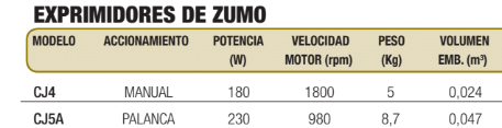 Características CJ4• Exprimidor eléctrico de aleación de aluminio barnizado.• Contenedor, filtro, protector de salpicaduras y conos de plástico extraíbles.• Triple cono.• Tensión 230V/50Hz