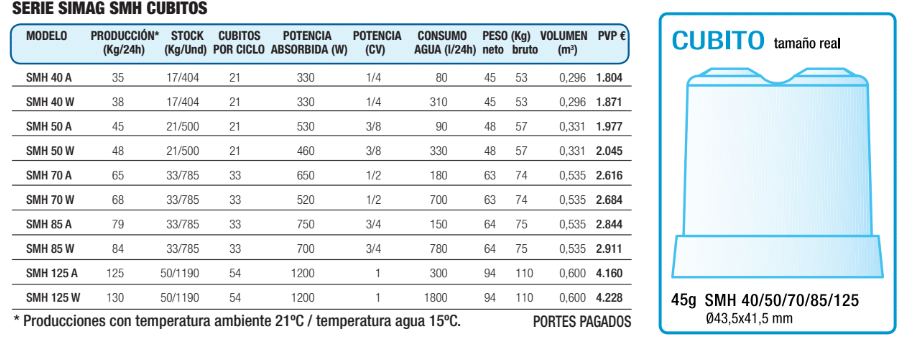 Características• Construida exteriormente en acero inoxidable acabado SCOTCH BRITE.• Refrigeradas por aire o agua.• Sistema de fabricación del hielo mediante difusores.• Bomba vertical.• Interruptor principal ON/OFF.• Sistema de limpieza incorporado.• Componentes fácilmente accesibles para su inspección o reparación.•Sistema de condensación controlado por válvula presostática parael ahorro de agua.• Óptima relación entre producción de hielo y capacidad de depósito.• Reducidas dimensiones.• Medidas sin patas.Con patas suplementarias +/- 105 a 125 mm.• Tomas de agua y desagües separadas, unas para la condensación yotras para la fabricación y cuba.• Refrigerante R134a en todos los modelos excepto en los modelosSMH 125 A/W, que poseen refrigerante R452a.• Temperatura ambiente de trabajo de 10ºC a 43ºC.• Temperatura del agua de 5ºC a 38ºC.• Presión de entrada de agua de 1 bar a 5 bar.• 2 años de garantía.• Tensión 230V/50Hz.