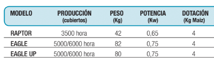 Características• Estructura en acero inoxidable AISI 304.• Túnel: los cubiertos atraviesan un tunel construido completamente enacero inoxidable AISI 304, cerrado pero inspeccionable. Esto permite elbajísimo nivel de ruido y permite utilizar resistencias de silício quepueden alcanzar altas temperaturas tanto para la sanificación de loscubiertos como para la eliminación de la humedad del salvado de maíz.• El modelo RAPTOR posee un moto-ventilador para permitir lasalida de la humedad de la máquina y recoger el exceso de la tusa demaíz de los cubiertos.•EAGLE:nuevo modelo automático versátil: se puede colocar sobre unamesa, empotrada o sobre un soporte.• Mandos electrónicos para asegurar un trabajo óptimo en condicioneshúmedas y con vibraciones. Display que indica la vida útil que le resta a latusa de maiz.•La máquina trabaja a una temperatura entre 100º/130ºCpara eliminarlos gérmenes patógenos de los cubiertos y del maiz, en conformidad conlas normas sanitarias de la H.A.C.C.P. No necesita luz ultravioleta.• Mandos a baja tensión (24 voltios). Tensión 230V/50Hz.• La tusa de maíz es un producto vegetal biodegradableque gracias a laevaporación se mantiene siempre seco y se puede utilizaraproximadamente 120 días.
