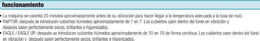 Características• Estructura en acero inoxidable AISI 304.• Túnel: los cubiertos atraviesan un tunel construido completamente enacero inoxidable AISI 304, cerrado pero inspeccionable. Esto permite elbajísimo nivel de ruido y permite utilizar resistencias de silício quepueden alcanzar altas temperaturas tanto para la sanificación de loscubiertos como para la eliminación de la humedad del salvado de maíz.• El modelo RAPTOR posee un moto-ventilador para permitir lasalida de la humedad de la máquina y recoger el exceso de la tusa demaíz de los cubiertos.•EAGLE:nuevo modelo automático versátil: se puede colocar sobre unamesa, empotrada o sobre un soporte.• Mandos electrónicos para asegurar un trabajo óptimo en condicioneshúmedas y con vibraciones. Display que indica la vida útil que le resta a latusa de maiz.•La máquina trabaja a una temperatura entre 100º/130ºCpara eliminarlos gérmenes patógenos de los cubiertos y del maiz, en conformidad conlas normas sanitarias de la H.A.C.C.P. No necesita luz ultravioleta.• Mandos a baja tensión (24 voltios). Tensión 230V/50Hz.• La tusa de maíz es un producto vegetal biodegradableque gracias a laevaporación se mantiene siempre seco y se puede utilizaraproximadamente 120 días.