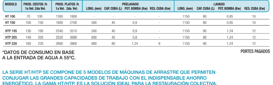 Características• Máquinas de lavadopor calentamiento eléctrico. Para calentamientopor vapor, consultar precios y plazos de entrega.• Máquinas sólidas con estructura en acero inoxidable AISI 304 satinado,compacta y patas regulables en altura.• Avance de cestos mediante barra central.• Amplias puertas abatibles en modelos HTP 195/205/220 para permitiruna fácil limpieza.DOBLE PARED DE SERIE EN TODOS LOS MODELOS.• Brazos de lavado y aclarado extraíbles en acero inoxidable.• Doble cuba embutida.• Protección panel de mandos IPXY.• Resistencias en acero INCOLOY para mejor protección contra losproductos corrosivos.• Bombas con sistema de autovaciado.• Entrada de cestas derecha o izquierda (confirmar a la hora derealizar el pedido).• Altura útil de todos los modelos: 500×430 (h) mm.• Antisalpicadero de 200 mm de serie a la entrada de la máquina,opcional a la salida, en modelos HTP 195/205/220.• Para un mejor resultado y duración, la dureza del agua tiene que serentre 4º y 10º franceses. En el caso de agua con niveles superiores dedureza, utilizar un descalcificador de agua.• No se suministran latiguillos de entrada de agua, ni tubos de desagüe.• Voltaje: 400V/III/50Hz. Para voltajes especiales consultar precios yplazos de entrega